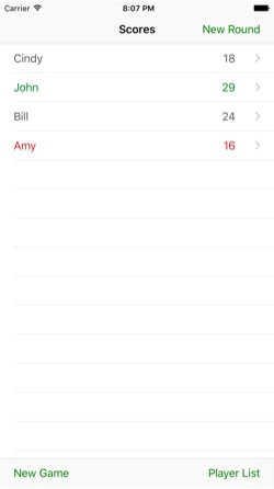 - • Color coded scores for winning and losing players at a glance